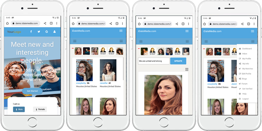iDateMedia also uses progressive web apps along with responsive design to allow visitors to view your dating site just like a dating app on any device without having to download an app from the app store. This means that your dating site will respond to any device whether it’s a tablet, desktop, laptop or mobile phone.